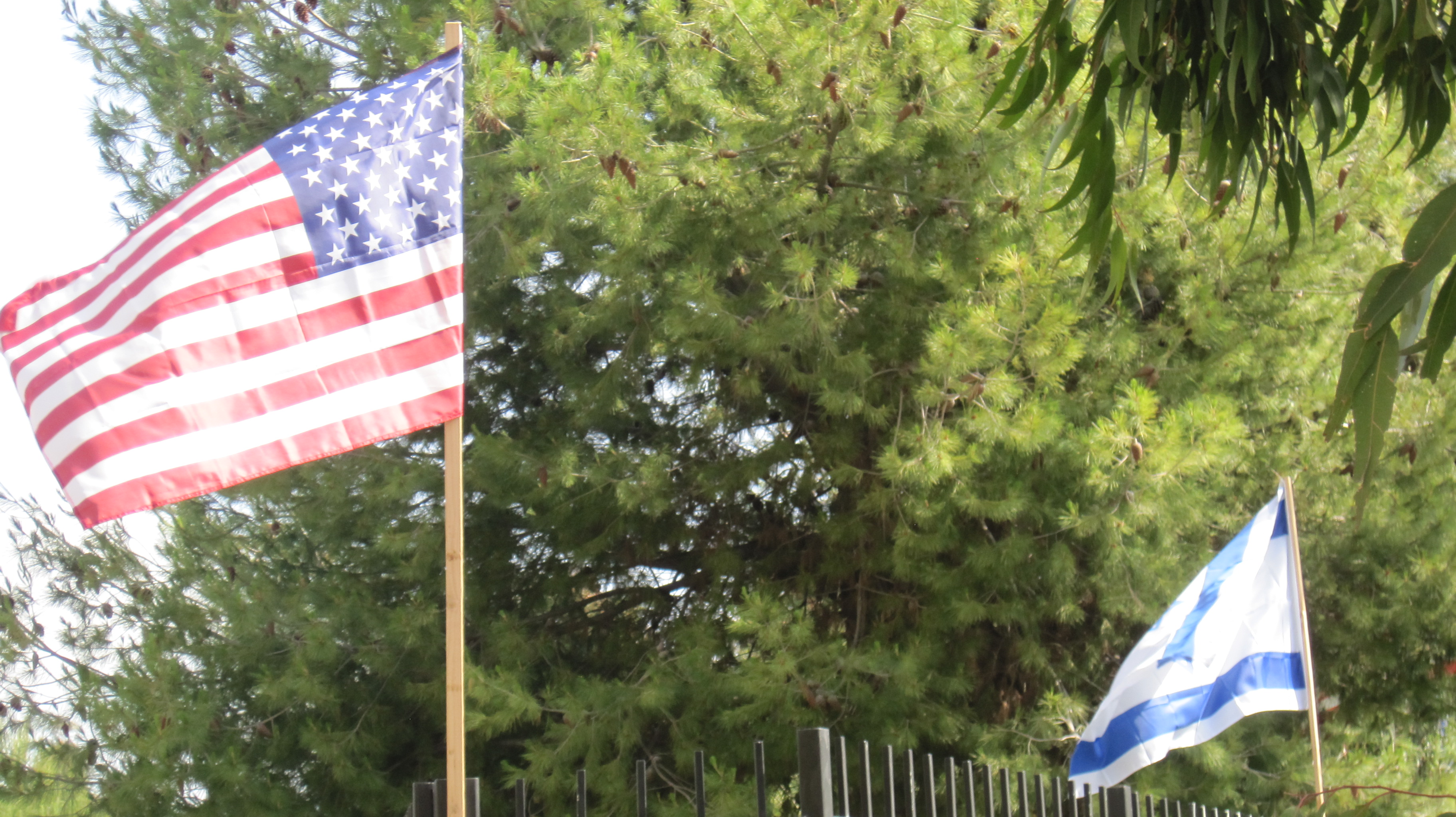 When the decorations went up earlier in the week, the perimeter of the fence was lined with Israeli flags. It looked beautiful. And utterly appropriate for an Israel celebration. And then…in miten drinen, American flags were added. For every kachol v’lavan, a corresponding Stars and Stripes.
